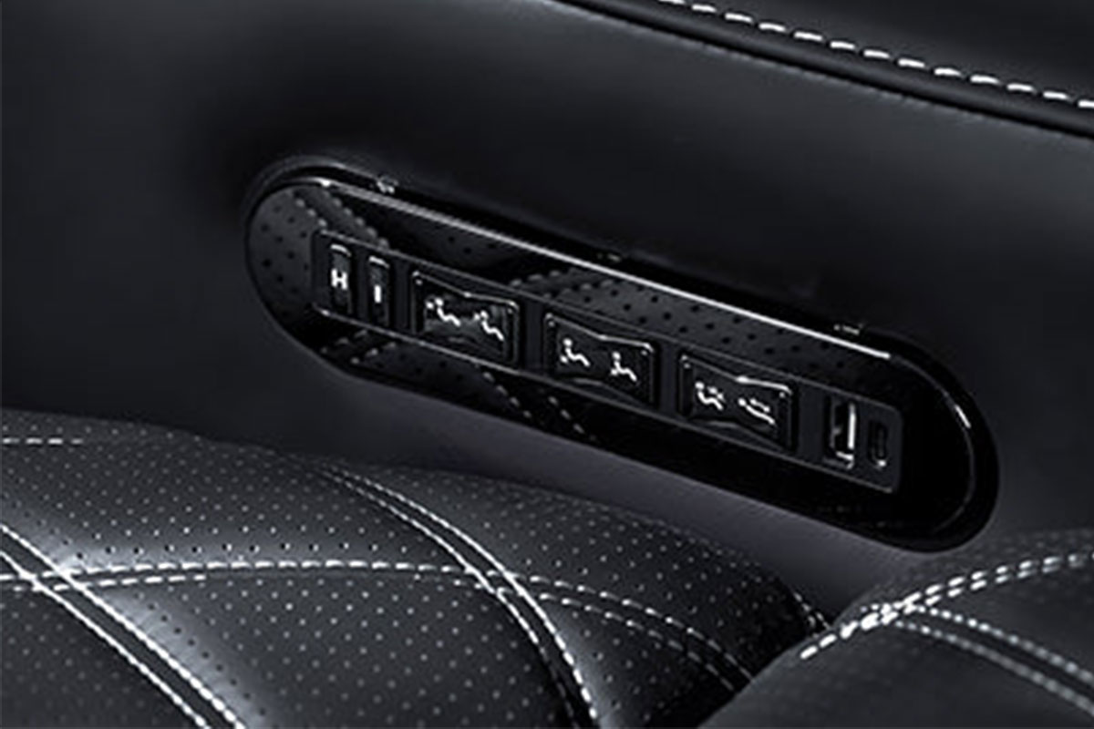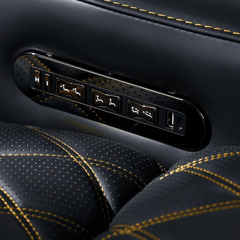 Controle fácilmente su asiento desde el reposabrazos, con puertos USB y USB-C para cargar dispositivos. Incluye función de memoria y botón de inicio para mayor comodidad.
